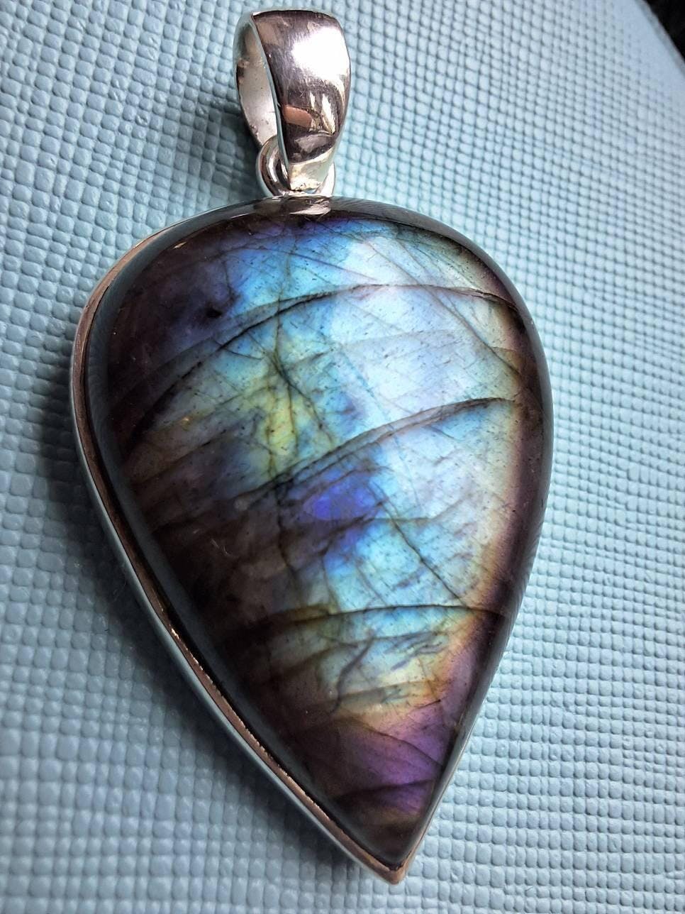 Chunky Large Multicolour Heart Labradorite Pendant set in 925 Sterling Silver. Stunning Blue Labradorite with hints of Purple on the edges, graduating to browns, Greens and Yellows leading to a central blue tone. A very unusual eye-catching piece. The pendant pictured is the actual piece you will receive.