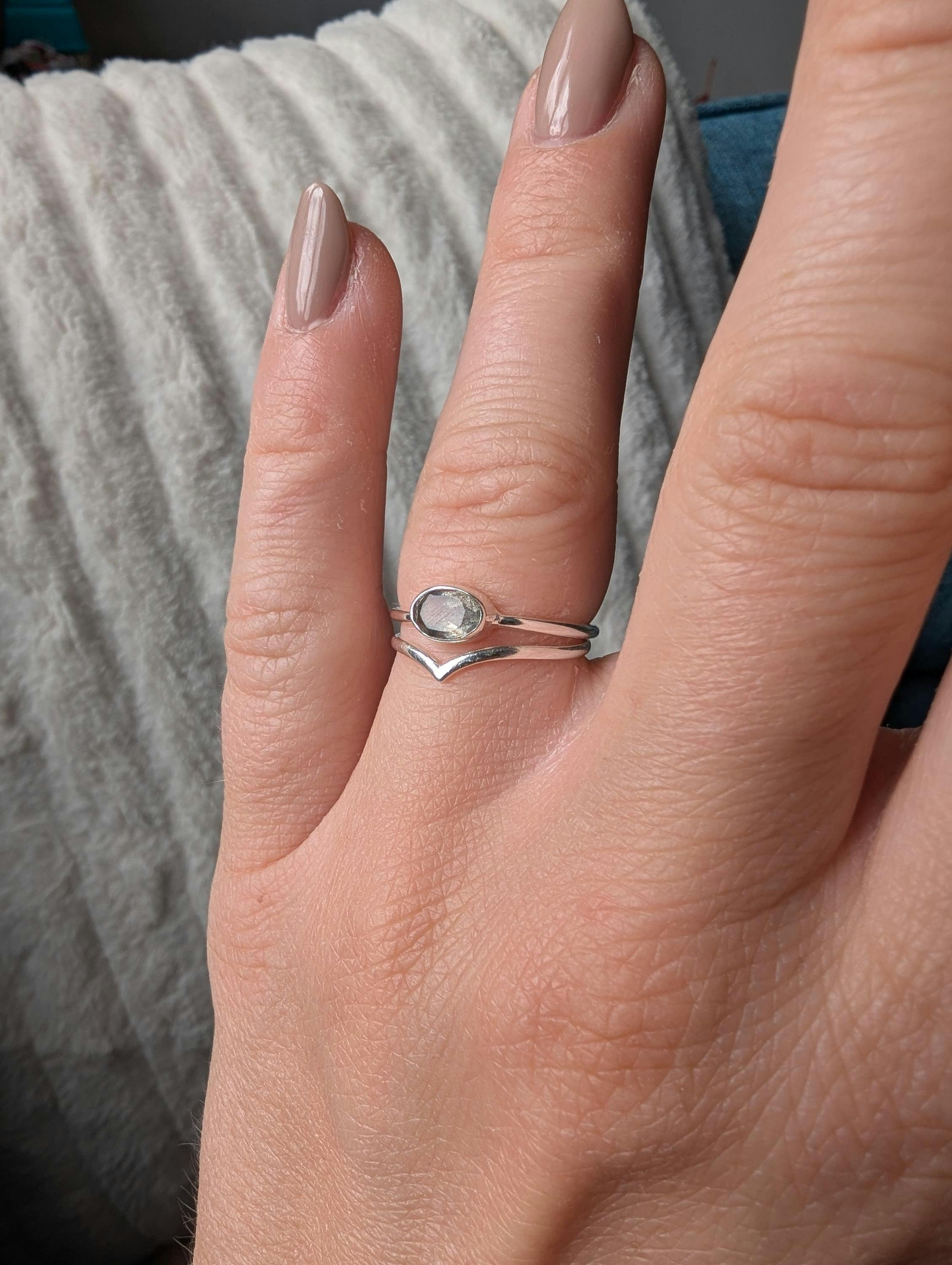 Minimalist unisex horizontal oval facetted labradorite ring crafted in 925 sterling silver. Featuring an iridescent blue gemstone, it’s perfect as a solitaire ring or stacking ring. A unique choice for an engagement ring.
