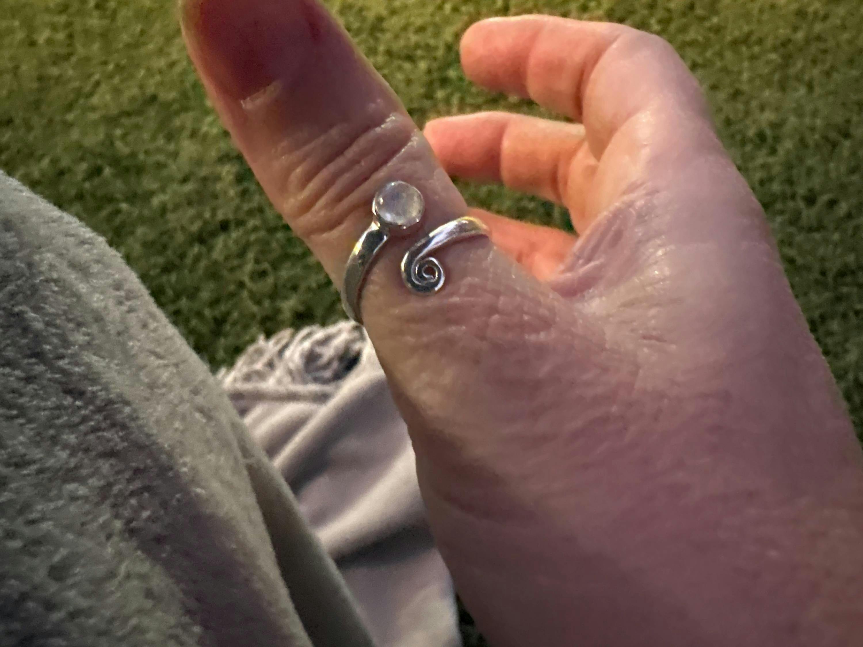 Unisex Spiral Adjustable Rainbow Moonstone Ring set in a 925 Sterling Silver Spiral Snake design. This iridescent blue gemstone Sterling Silver ring wraps beautifully around the finger, creating a real unique, statement look. Great worn as a Delicate silver Thumb Ring for Men and Women. Ideal present for a June Birthday.