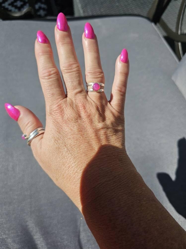 Contemporary Round Hot Pink Agate Ring set in 925 Sterling Silver with slight texture on the band