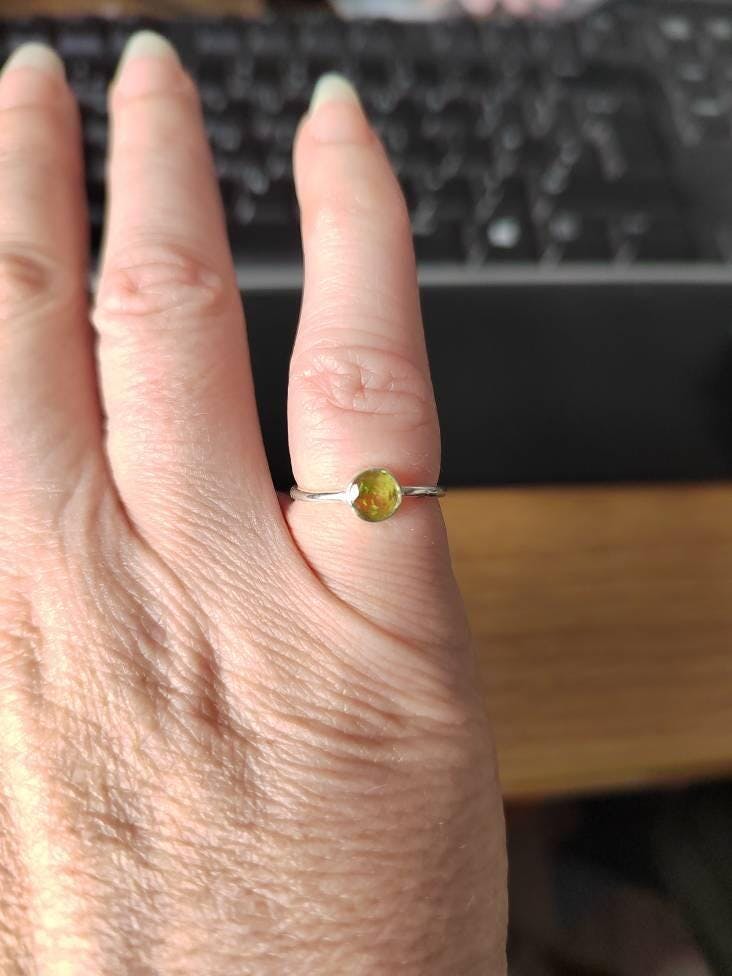Round Facetted Peridot Stacking Ring set in a plain Rounded 925 Sterling Silver band. Great worn as a dainty Solitaire ring on its own or as a stacking ring.